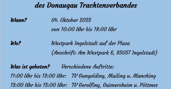 Brauchtumstag des Donaugau Trachtenverbandes Datum/Zeit Datum : 04.10.2025Uhrzeit: 10:00 bis 18:00 Veranstaltungsort Westpark Ingolstadt