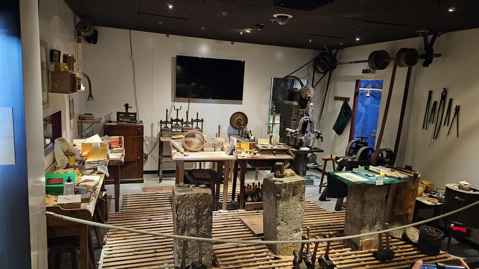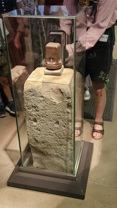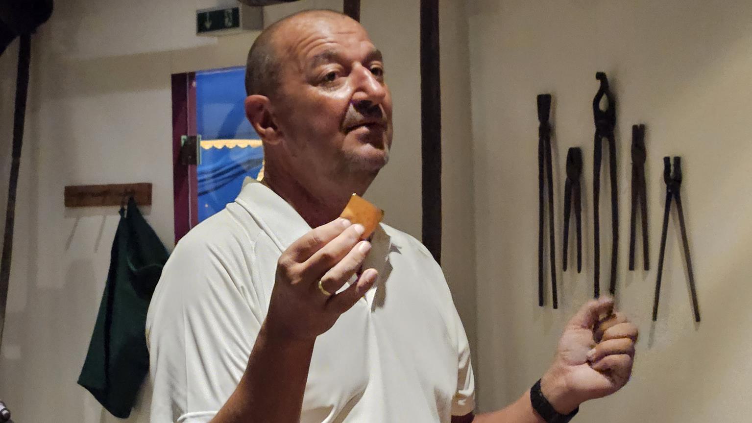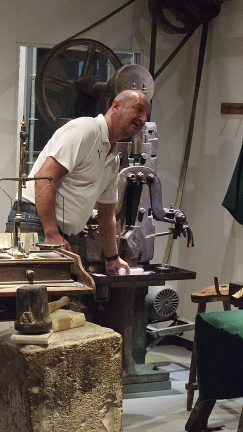 Im Stadtmuseum von Schwabach begrüßte uns Werner Auer, Goldschlägermeister, vor der sogenannten Goldbox. In der Goldbox ist eine voll funktionsfähige Goldschlägerwerkstatt nachgebaut. Nach einem kurzen geschichtlichen Abriss über Gold, von den alten Indern (3000 v. Chr.) bis heute und warum ausgerechnet Schwabach zur Goldschlägerstadt wurde, gab Herr Auer sein Können zum Besten. Er erklärte die einzelnen Schritte theoretisch und praktisch vom Goldbarren bis zum 1/10.000 mm dünnen Blattgold.