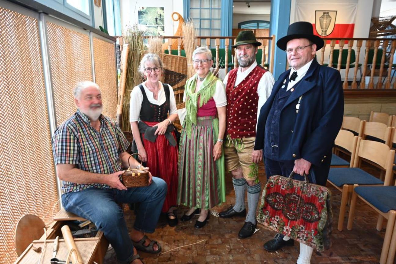 Nach Ankunft in Michelau empfing uns Gisela Haußner (Verantwortliche des Sachgebietes Brauchtum im Bayerischen Trachtenverband sowie des Sachgebietes Brauchtum, Mundart und Laienspiel im Donaugau-Trachtenverband), zusammen mit Marianne Heidenthaler, Vorsitzende des Sachgebiets Brauchtum, Mundart, Laienspiel beim Bayerischen Trachtenverband, vor dem örtlichen Korbflechtermuseum.